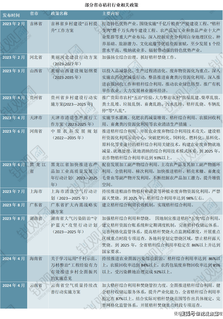我国各省市也积极响应国度政策规划,对各省市秸秆行业的成长做出了具体规划,支撑本地秸秆行业不变成长,好比云南省发布的《云南省空气质量持续改动实施方案》提出加大秸秆分析操纵和焚烧管控力度,全面推进秸秆分析操纵。健全秸秆收储运办事系统,提拔财产化能力。全省秸秆分析操纵率不变正在87%以上。连系现实对秸秆禁烧范畴等做出具体,完美网格化监管系统,开展秸秆焚烧沉点时段专项放哨。